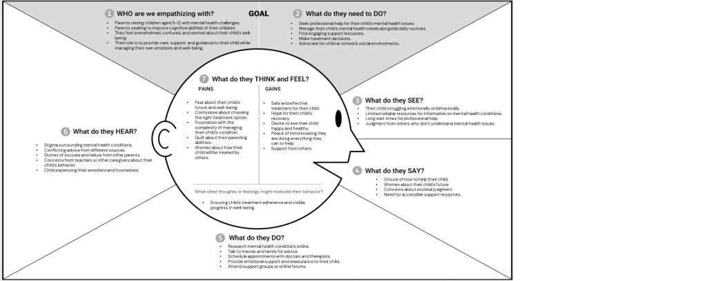 It helped us identify various archetypes among parents and children, shedding light on the unique circumstances and needs of different user groups. Empathy mapping delved deeper into user emotions and motivations, unveiling not only their goals and challenges but also the external factors influencing their decisions. Furthermore, customer journey mapping pinpointed specific pain points in the user’s interaction with the app, enabling the development of strategies to enhance user experience across all stages, from initial awareness to post-engagement support, ensuring a smooth and satisfying journey. These insights proved instrumental in understanding user perspectives and thinking of ways to empower children on their journey towards mental wellness.
