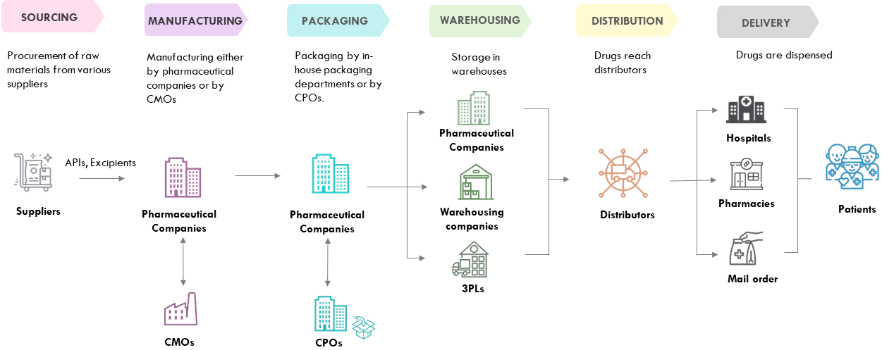 The pharmaceutical supply chain encompasses several stages such as sourcing raw materials, manufacturing, packaging, warehousing, and distribution. Each of these stages has distinct requirements and challenges.