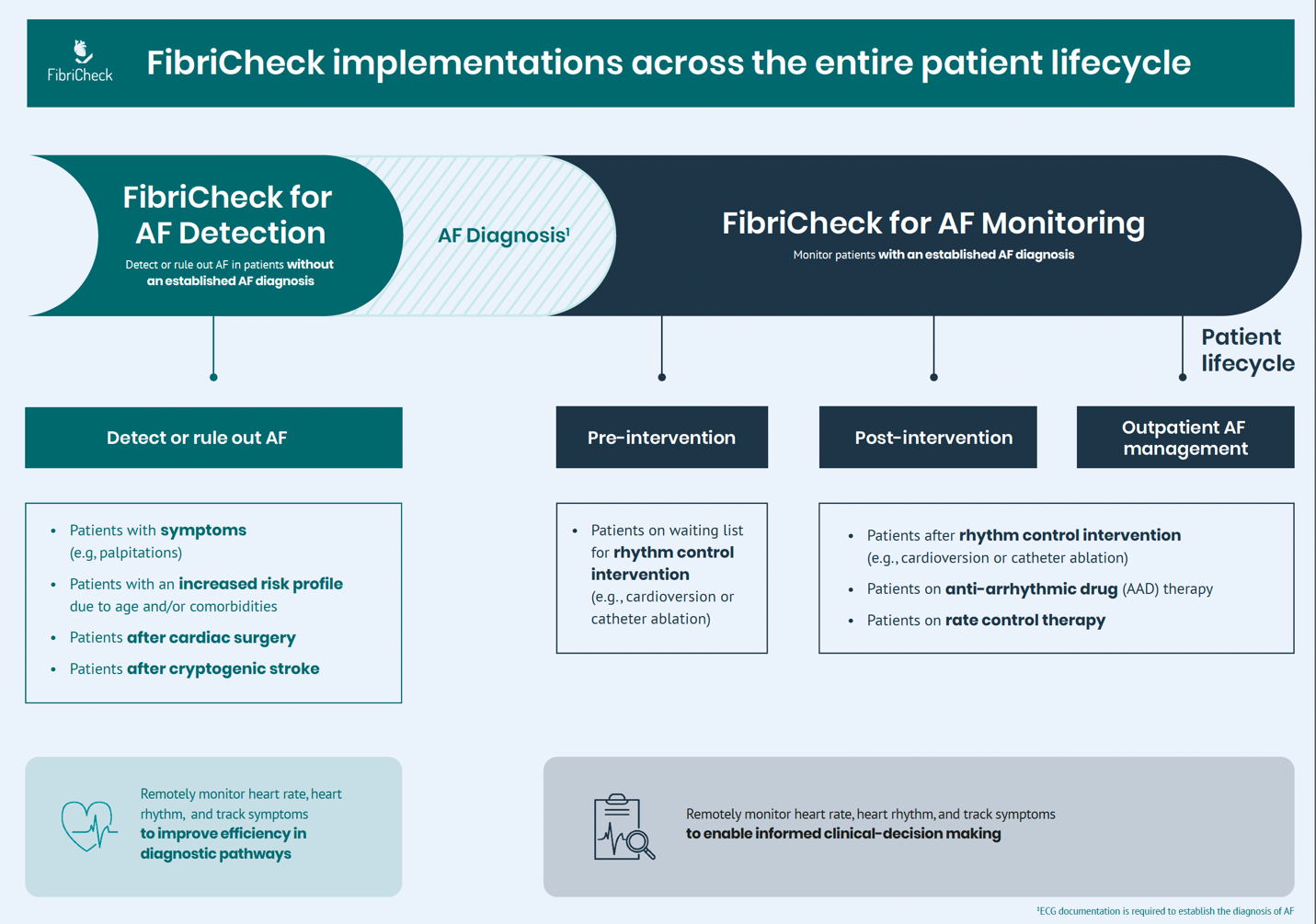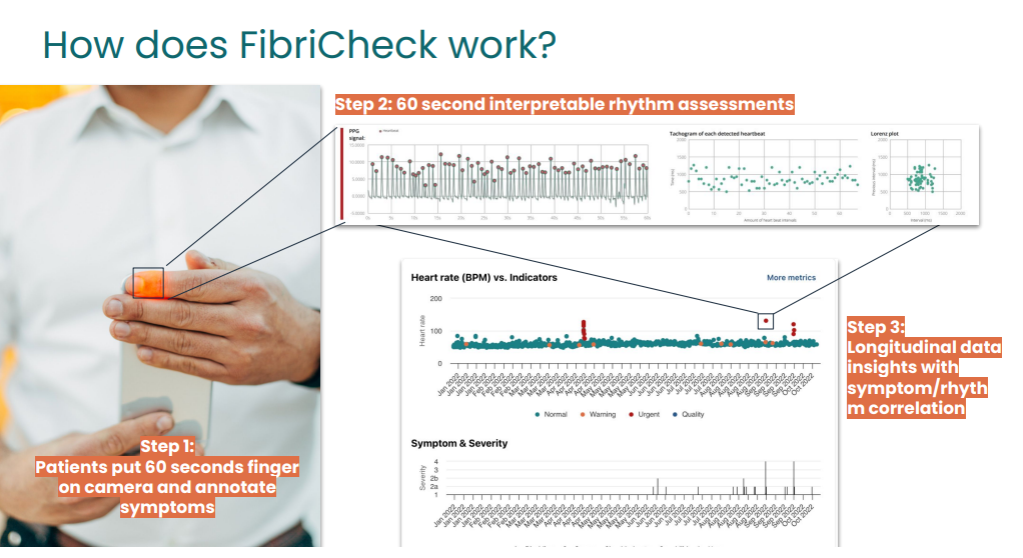Cardiac health monitoring traditionally requires frequent visits to clinics or hospitals. Although several digital health tools exist to measure and monitor heart rhythms, few offer seamless integration with provider portals or deliver near real-time data updates to clinicians. FibriCheck addresses this gap by enabling patients to monitor their cardiac health conveniently and privately—without additional hardware—while offering providers timely, actionable insights. This model enhances efficiency and is poised to improve clinical outcomes.